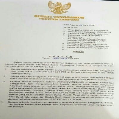 Kotaagung, – Dalam rangka mensukseskan Pilkada Serentak, Pemilihan Gubernur dan Pemilihan Bupati Tanggamus, Pj. Bupati Tanggamus terbitkan Surat Himbauan kepada masyarakat untuk mendatangi TPS dalam rangka melaksanakan Hak pilihnya. Dan juga kepada seluruh pimpinan Instansi, BUMN, BUMD, mengintruksikan jajaranya.