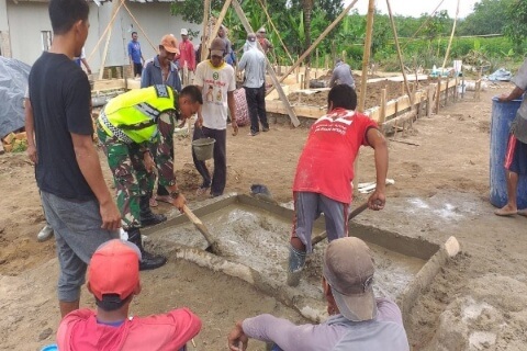 Menggala Timurn(HS) – Bintara Pembina Desa (Babinsa) Koramil 426-02/Menggala, Kodim 0426/Tulang Bawang, bergotong royong membangun rumah warga di Kampung Kibang Pacing, Kecamatan Menggala Timur, Kabupaten Tulang Bawang, Sabtu (22/02/2020).