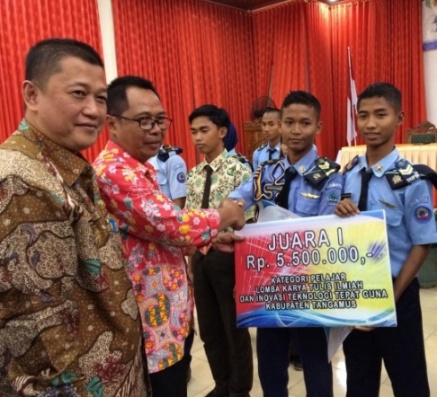 Juara 3 Jerri Aprian Hedi, Marya Ulfa, Maycky Nugraha Putra, dan Wildan Ramadhan (SUPM Negeri Kota Agung) dengan makalah Pemanfaatan Limbah Dari Ekstraksi Kulit Ikan/Gelatin Sebagai Emulsifier Es Krim.