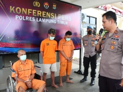 Kapolres Lampung Timur AKBP Zaky Alkazar Nasution, diwakili Wakapolres Kompol Sugandhi SN, saat memimpin konferensi pers, menjelaskan bahwa inisial para tersangka adalah SA (29) warga Kecamatan Gunung Pelindung, RK (27) dan HB (20) warga Kecamatan Jabung.