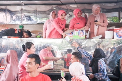 Ny. Lurie Helmy Santika didampingi oleh Ketua Seksi Organisasi Pengurus Daerah Bhayangkari Lampung, Ny. Putri Nowo, serta Sekretaris PYKB Daerah Lampung, Ny. Wanda Benteng, aktif terlibat dalam pembagian makan gratis kepada para pemudik yang sedang melakukan perjalanan pulang kampung.