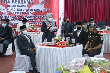 Ditempat berbeda, Bupati Hj. Dewi Handajani dalam sambutannya, mengucapkan Puji dan Syukur dimana pada hari ini dapat bertemu secara langsung maupun secara Virtual, kita melaksanakan Doa Bersama Dalam Rangka Hari Jadi ke-25 Kabupaten Tanggamus Tahun 2022, dalam suasana aman, damai penuh suka dan cita.