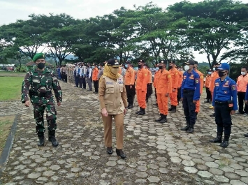 Kota Agung (HS) – Bupati Tanggamus Hj Dewi Handajani, memimpin apel Kesiapsiagaan Bencana dan Sinergitas Penanggulangan Bencana Ekstrim Kabupaten Tanggamus Tahun 2021, di Lapangan Pemkab Tanggamus, Selasa (30/11/2021).