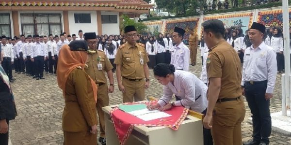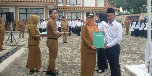 Tanggamus (HS)~ Bupati Tanggamus Dewi Handajani ambil sumpah dan janji Pegawai Pemerintah dengan Perjanjian Kerja (PPPK) Guru, di halaman sekretariat Bupati Tanggamus Selasa (29/08/2023).
