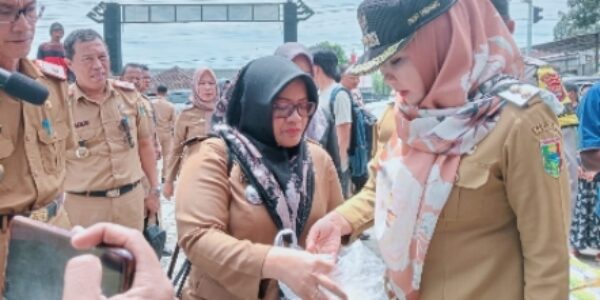 Tanggamus (HS) – Bupati Tanggamus Hj Dewi Handajani meninjau BAZAR Beras Murah Pelaksanaan Distribusi Beras Stabilitasi Pasokan dan Harga Pangan (SHP), di GSG Pekon Gisting Bawah Kecamatan Gisting. Selasa (14/2/2023).