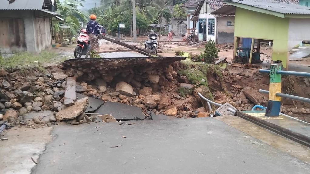 “Desa kami di dusun pematang awi ke banjiran jembatan satu pondasinya ambruk dan satu rumah milik warga atas nama pak Muhrodin hanyut tinggal tersisa Wcnya tapi tidak ada korban jiwa,” Kata Tohir.