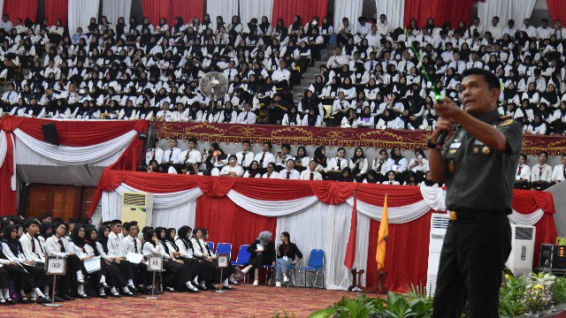 Bandar Lampung (HS) – Komandan Korem 043/Gatam Brigjen TNI Rikas Hidayatullah, memberikan materi tentang Kehidupan Berbangsa, Bernegara dan Pembinaan Kesadaran Bela Negara, pada Program Pengenalan Kehidupan Kampus Mahasiswa Baru (PKKMB) Tahun 2024 kepada 3.000 Mahasiswa Baru Universitas Lampung (Unila), Kamis (15/08/2024).
