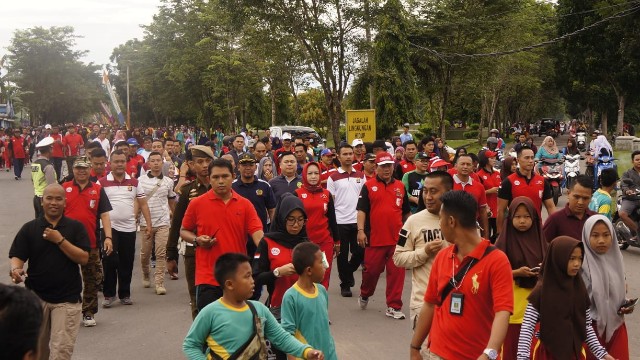 Menggala (HS),- Dalam rangkaian acara HUT Kabupaten Tulangbawang yang Ke-22 tahun, Pemkab mengadakan jalan sehat, diikuti enam ribuan peserta berjalan meriah, Selasa (12/03/2019).