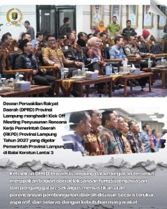Bandar Lampung (HS) – Dewan Perwakilan Rakyat Daerah (DPRD) Provinsi Lampung menghadiri Kick Off Meeting Penyusunan Rencana Kerja Pemerintah Daerah (RKPD) Provinsi Lampung Tahun 2027 yang digelar Pemerintah Provinsi Lampung di Balai Keratun Lantai III, Komplek Perkantoran Pemerintah Provinsi Lampung, Kamis (15/01/2026).