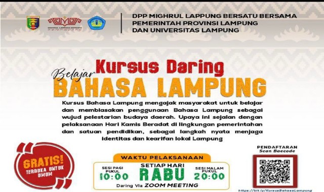BANDAR LAMPUNG (HS) — Upaya pelestarian budaya daerah terus diperkuat melalui berbagai inovasi. Mendukung gerakan Hari Kamis Beradat di lingkungan pemerintah dan satuan pendidikan, Dewan Pengurus Pusat (DPP) Mighrul Lampung Bersatu berkolaborasi dengan Pemerintah Provinsi Lampung dan menghadirkan program Kursus Daring Bahasa Lampung yang terbuka gratis bagi masyarakat luas.