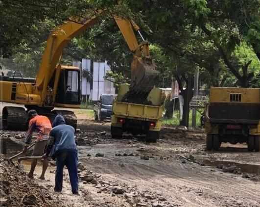 Tampak alat berat dan pekerja memulai perbaikan jalan yang selama ini mendapat keluhan pengguna.