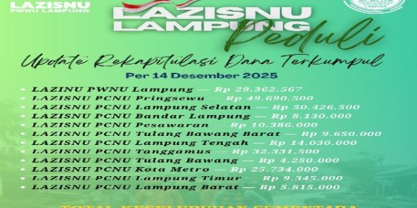 Ia menyampaikan, hingga saat ini donasi yang berhasil dihimpun telah mencapai Rp256 juta dan masih berpotensi terus bertambah. Selain donasi uang, bantuan berupa barang juga telah disalurkan melalui NU Care–LAZISNU PCNU di masing-masing daerah.