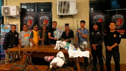 Bersama pelaku, juga diamankan barang bukti 1 unit senjata api rakitan laras panjang berwarna hitam, 1 buah golok, 32 butir amunisi kaliber 5,56mm, 3 unit sepeda, 1 buah senter, 1 buah karung warna putih, 2 buah karung warna hijau, 1 set perbekalan nasi untuk bertahan hidup di hutan TNWK.