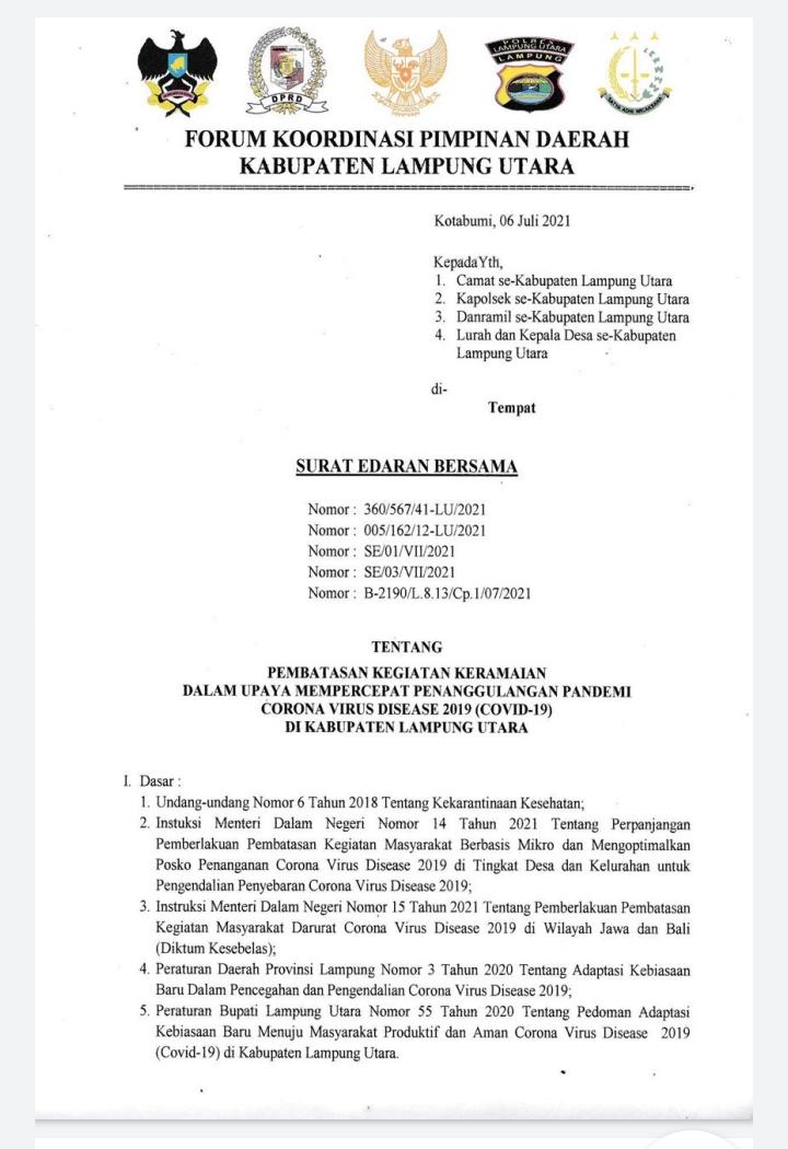 Menyikapi situasi ini, Pemkab Lampung Utara bersama Forkopimda, mengeluarkan surat edaran resmi.