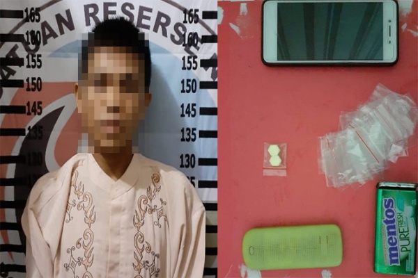“Disana, petugas kami berhasil menangkap pelaku dan menyita BB (barang bukti) berupa plastik klip yang berisi dua butir narkotika jenis inex, 25 bungkus plastik klip, dua buah pipet yang ujungnya berbentuk runcing (sekop), kotak permen mentos warna hijau, HP (handphone) Nokia warna hijau dan HP Oppo warna putih,” ungkap Iptu Boby.