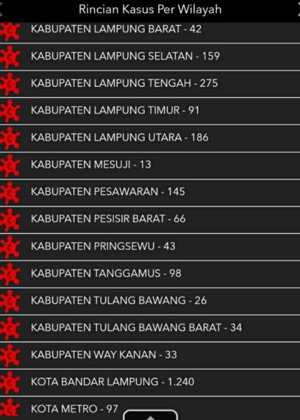 Dari total kasus positif, Kota Bandar Lampung masih menempati posisi tertinggi dengan 1.240 kasus, disusul Lampung Tengah 275kasus, Lampung Utara 186 kasus, Lampung Selatan 159 kasus, Pesawaran 145 kasus. Sementara 10 daerah lainnya masih dibawah 100 kasus.