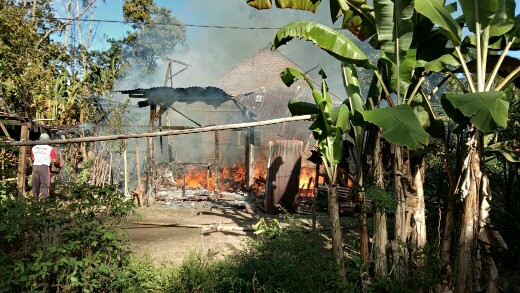 Musibah kebakaran menimpa rumah Selamat bermaterial geribik; Rumah Acin bermaterial permanen dengan dapur geribik dan Rumah Ali bermaterial Geribik.