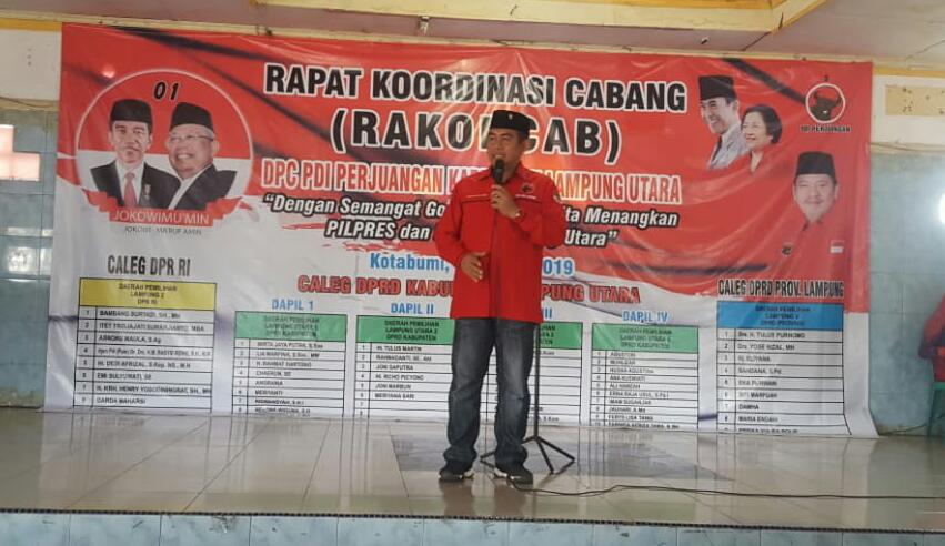 KOTABUMI (HS) – Kegiatan Rapat Koordinasi Cabang (Rakorcab) Dewan Pimpinan Cabang (DPC) Partai Demokrasi Indonesia Perjuangan (PDI-P), yang dilaksanakan di ruang seminar Rumah Makan Taruko Jaya I Kotabumi, Selasa, (12/3/19).