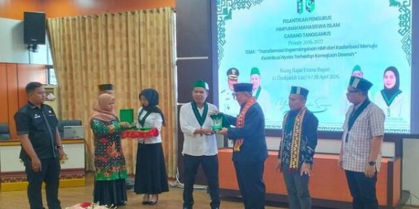 TANGGAMUS (HS) – Suasana khidmat menyelimuti Ruang Rapat Utama Kantor Bupati Tanggamus, Selasa, 28 April 2026. Lantunan kalimat syahadat menggema, mengiringi prosesi pelantikan pengurus Himpunan Mahasiswa Islam (HMI) Cabang Tanggamus periode 2026–2027.