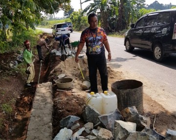 KOTABUMI (HS) – Ketua KP TIPIKOR Lampung Utara, Bodwien.S.Sos, yang juga merupakan ketua pemuda pancasila Kecamatan Abung Timur, turun ke lapangan melihat pembuatan siring pasang yang terletak di Desa Banjar Agung, Daerah setempat, Sabtu (13/7/19).