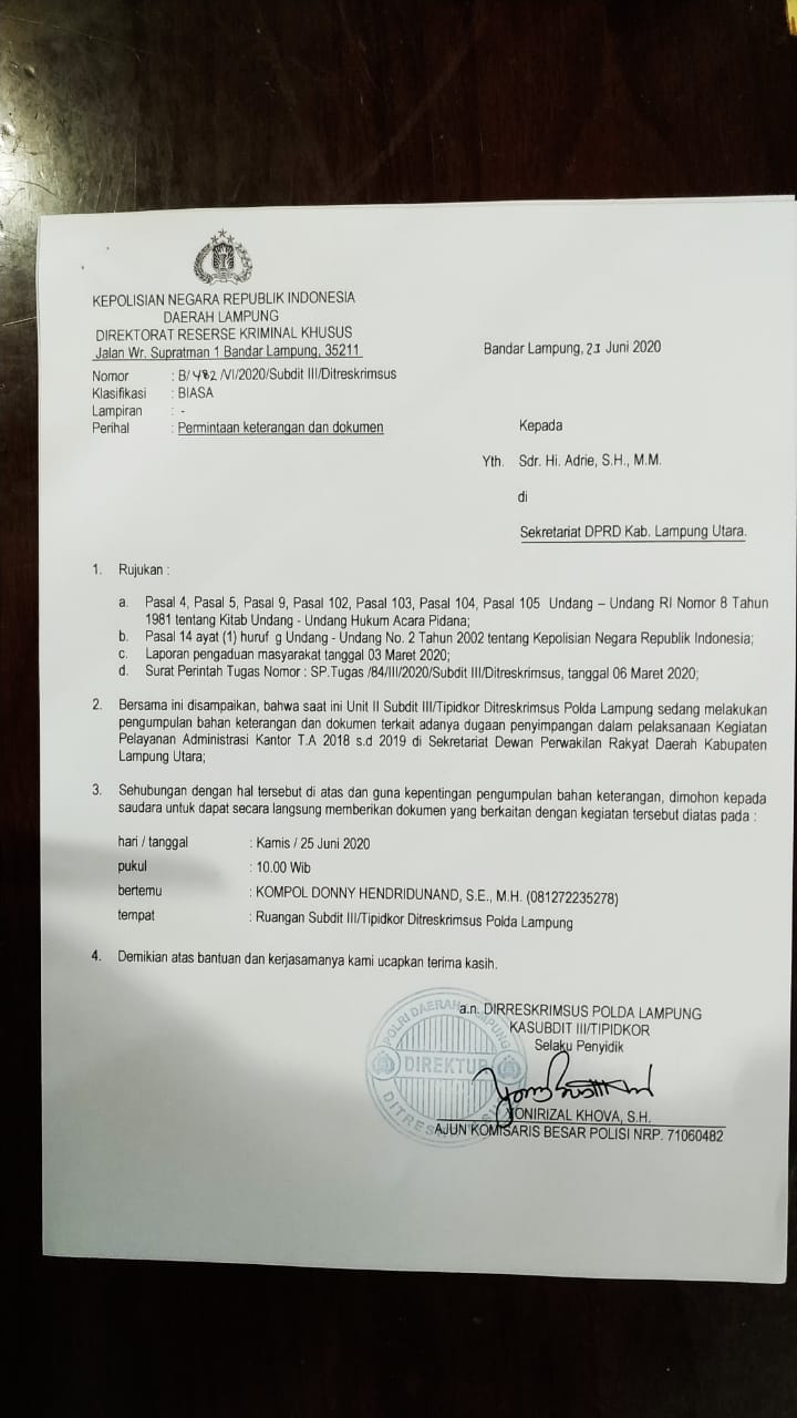 Melalui surat panggilan Direktorat Reserse Kriminal Khusus Polda Lampung, bernomor B/482/VI/2020/Subdit III/Direskrimsus, Adrie, Sekretaris Dewan setempat diundang untuk dimintai keterangan dan dokumen pada hari Kamis 25 Juni 2020 mendatang.