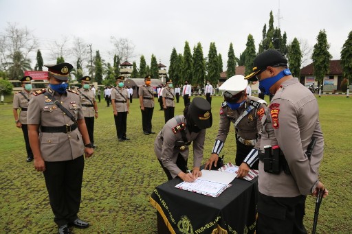 “Kepada pejabat yang baru Laksanakan Job Description mu dengan sebaik-baiknya dan penuh dengan rasa bertanggung jawab,” ujar AKBP Bambang Yudho Martono, S.I.K., M,Si.(*/ef).