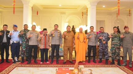 Bandar Lampung (HS) — Kapolda Lampung Irjen Pol Dr.Akhmad Wiyagus bersama Gubernur Lampung Arinal Djunaidi, Danrem 043/Gatam diwakili oleh Kasi Intel Kolonel Inf. Roy Hansen Jongguran Sinaga, Danlanal Lampung Letkol Laut (P) Zul Fahmi,S.E.,M.Tr.Hanla.,M.M., meninjau ibadah malam perayaan Tahun Baru Imlek 2574 Kongzil di sejumlah Vihara di Kota Bandar Lampung.