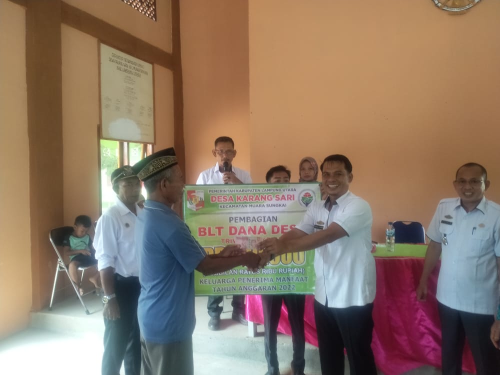 Kotabumi (HS) – Pemerintah Desa ( Pemdes) Karang Sari Kecamatan Muara Sungkai, Kabupaten Lampung Utara, telah menyalurkan bantuan langsung tunai ( BLT) dari anggaran dana desa ( DD) tahap II 40 persen, untuk bulan April sampai dengan Juni serta Juli sampai September sebanyak 106 Keluarga penerima manfaat (KPM) dengan rincian 49 via Transfer 57 disalurkan dengan secara tunai.