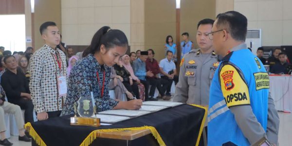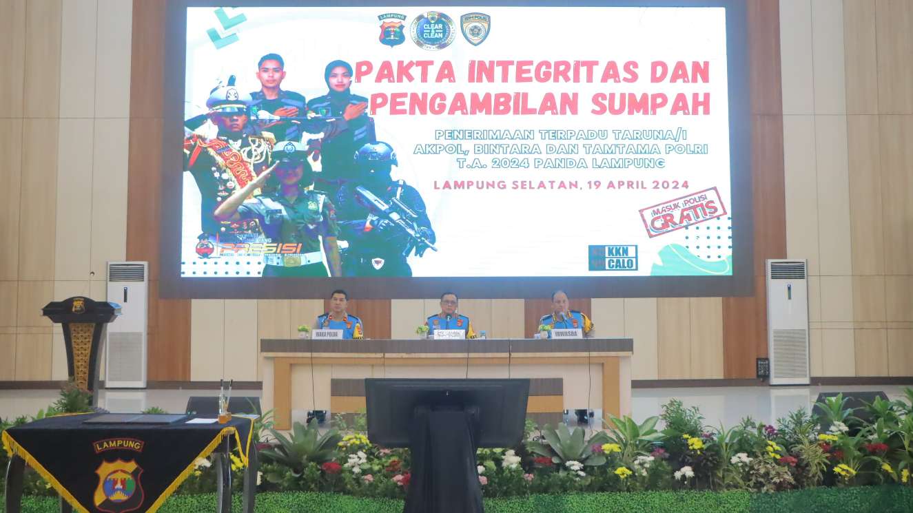 Bandar Lampung (HS) – Kapolda Lampung Irjen Pol Helmy Santika menghadiri Pelaksanaan Kegiatan Pakta Integritas dan Pengambilan Sumpah Seleksi Penerimaan Terpadu Taruna/i Akpol, Bintara dan Tamtama Polri TA. 2024 Panda Lampung, bertempat di GSG Polda Lampung, Jum’at (19/4/2024).