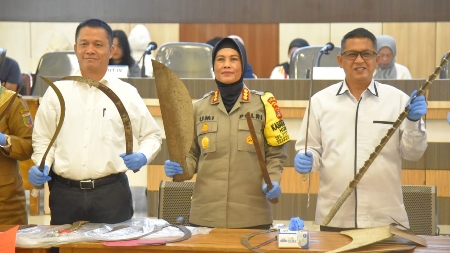 Adapun barang bukti yang behasil diamankan 14 (empat belas) bilah senjata tajam yang menyerupai Celurit terbuat dari plat besi berbagai ukuran, 3 (tiga) bilah senjata tajam jenis pedang terbuat dari plat best, 1 (satu) buah senjata yang menyerupal gergaji yang terbuat dari rangka besi berukuran + 100 (seratus) Cm, 1 (satu) buah mesin gerinda berikut mata gerinda, 9 (sembilan) unit Motor (R2) berbagai merk, 21 (dua puluh satu) unit handphone berbagai macam merk.