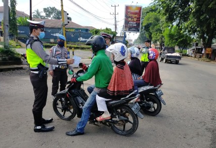 Lampung Utara – Dihari kedua pelaksanaan Ops Keselamatan Krakatau 2020 Satuan lalu Lintas Polres Lampung Utara memberikan masker dan himbauan berkaitan dengan pencegahan penyebaran Virus Corona (Covid-19), Selasa (7/4/2020).