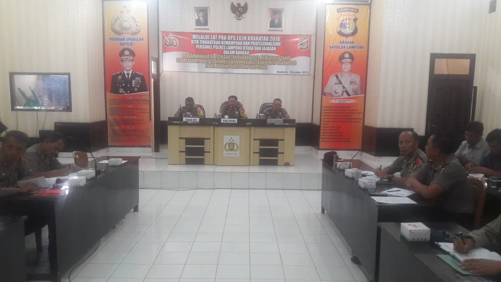 Kotabumi (HS) – Jelang perayaan Natal 2018 dan Tahun Baru 2019 Kapolres Lampung Utara yang diwakili oleh Wakapolres, Kompol Yustam Dwi Heno, S.H., S.I.K., M.M. didampingi oleh Kabag Ops, Kompol Nelson F. Manik, S.H. pimpin pelaksanaan Lat Pra Ops Lilin Krakatau 2018 di Aula Rekonfu Polres Lampung Utara, Kamis (20/12/18).