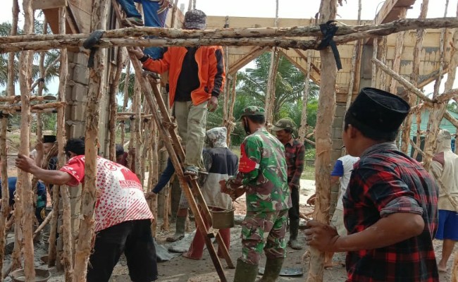 Rawapitu (HS) – Babisa Korail 426-05 Penawar Aji, Serda Jumono bersama warga Ponpes Darul Salam ikut Gotongroyong bangun Masjid di Kampung Panggung Mulyo, Kecamatan Rawapitu, Kabupaten Tulang Bawang, Sabtu (23/012021)