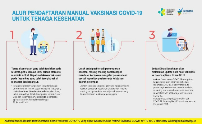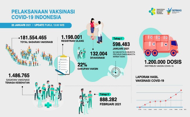 “Di tahap pertama, kami menyebarkan undangan bagi 598.483 tenaga kesehatan dari target 1,47 juta. Sisa 888.282 tenaga kesehatan sudah mulai diberikan undangan di 21 Januari kemarin. Jika ada tenaga kesehatan yang belum terdaftar di tahap pertama, kemungkinan mereka ada di kelompok kedua,” ungkap Juru Bicara Kementerian Kesehatan dr. Siti Nadia Tarmizi.