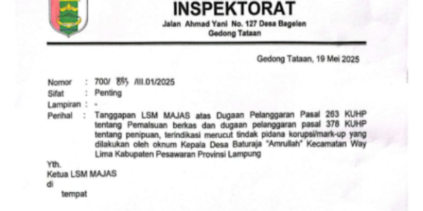 Indikasi Pungli Program BSMS di Desa Baturaja, Ini Jawaban Inspektorat Pesawaran