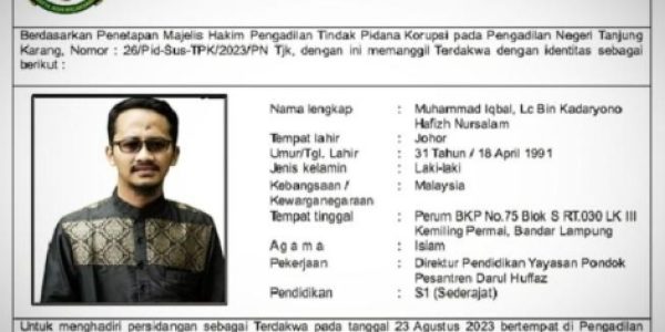 Kejari Pesawaran Terbitkan Surat Panggilan Sidang Terhadap DPO Korupsi dana Bos Ponpes Darul Huffaz