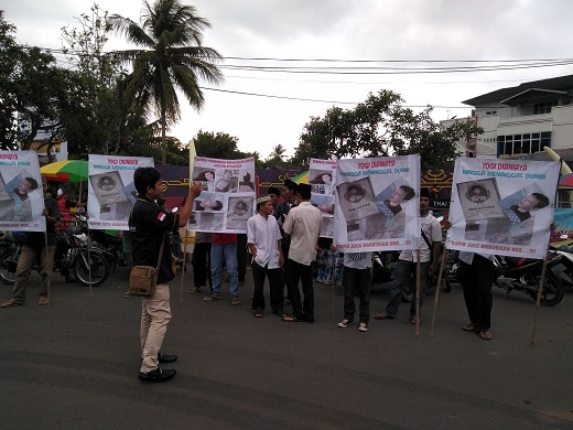 Kotabumi (HS) – Angkatan Muda Lampung Utara, menggelar aksi solidaritas doa bersama dan menyalakan seribu lilin disekeliling keranda mayat yang berlangsung di Bundaran Tugu Payanmas Kotabumi, Lampung Utara. Ini merupakan kepedulian pemuda Lampung Utara untuk mendukung Kepolisian Resor (Polres) Lampung Utara untuk penegakan supremasi hukum dalam proses laporan ibu Yogi Andhika yang diduga meninggal dunia karena mendapatkan penganiayaan, Senin (26/3/18)