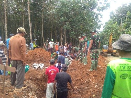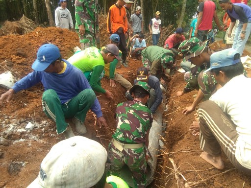 KOTABUMI (HS) – Satgas TMMD, TNI Komando Distrik Militer (Kodim) 0412 Lampung Utarake-105 bersama warga Desa Batu Nangkop, Sungkai Tengah, gotong royong membangun gorong-gorong buis beton, Minggu (14/07/19).