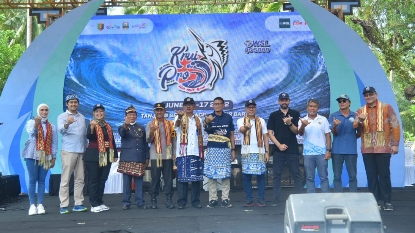 Pembukaan WSL Krui Pro QS 5000 berlangsung meriah, ditandai dengan pemukulan gong secara bergilir oleh Menparekraf, Wakil Ketua MPR, Wagub Lampung, Wakapolda Lampung, dan Bupati Pesisir Barat. (gnd/penmas/san)
