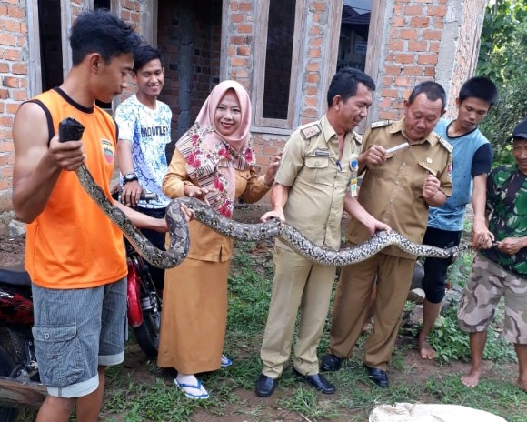 Binatang reptil itu ditangkap warga tadi malam sekitar pukul 20.00 WIB, dibelakang rumah Tami warga RT 5, setelah diketahui usai memangsa tiga ekor ayam dibelakang rumah warga.